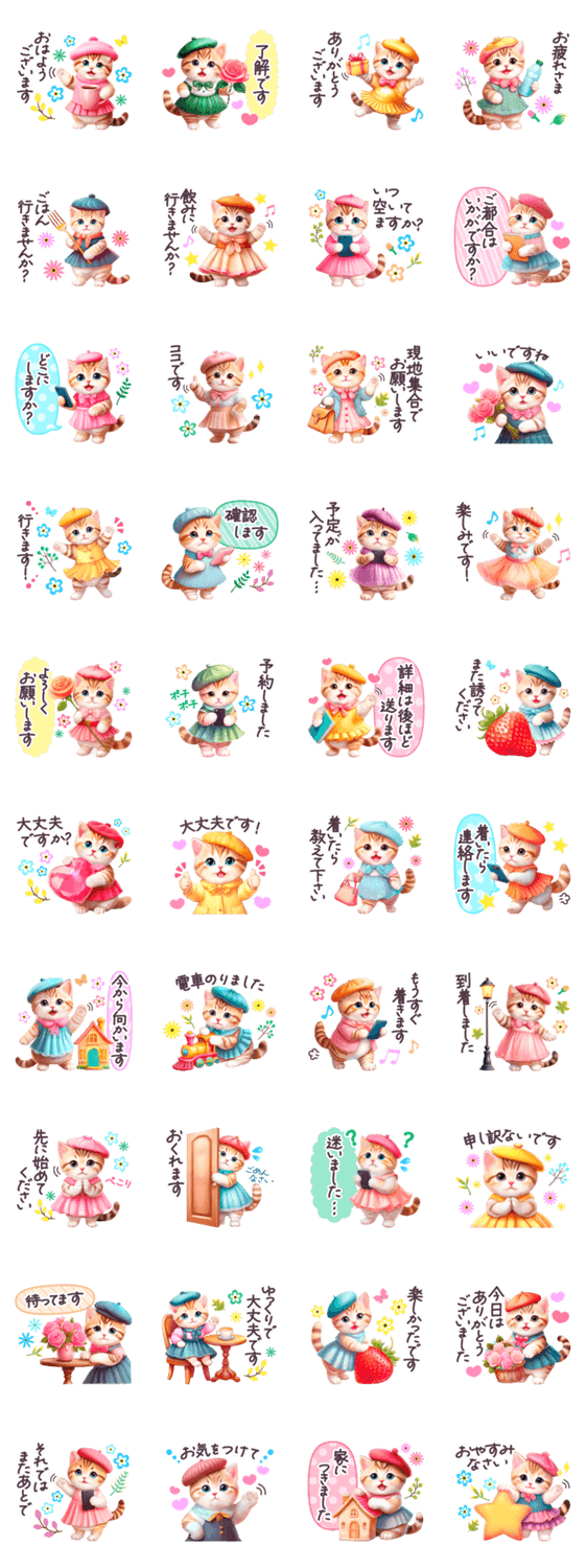 ベレー帽とワンピースのネコの待ち合わせに便利なスタンプ。猫/ねこ/ネコ/子猫/子ねこ/毎日/連絡/敬語/丁寧/約束/お誘い/待合せ/グループ/家族/友達/毎日使える/動物