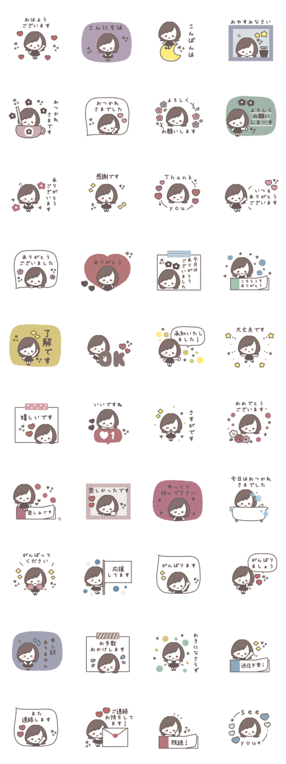 一つあると便利な女の子のスタンプです。 女の子/ボブ/大人可愛い/シンプル/あいさつ/吹き出し/くすみカラー