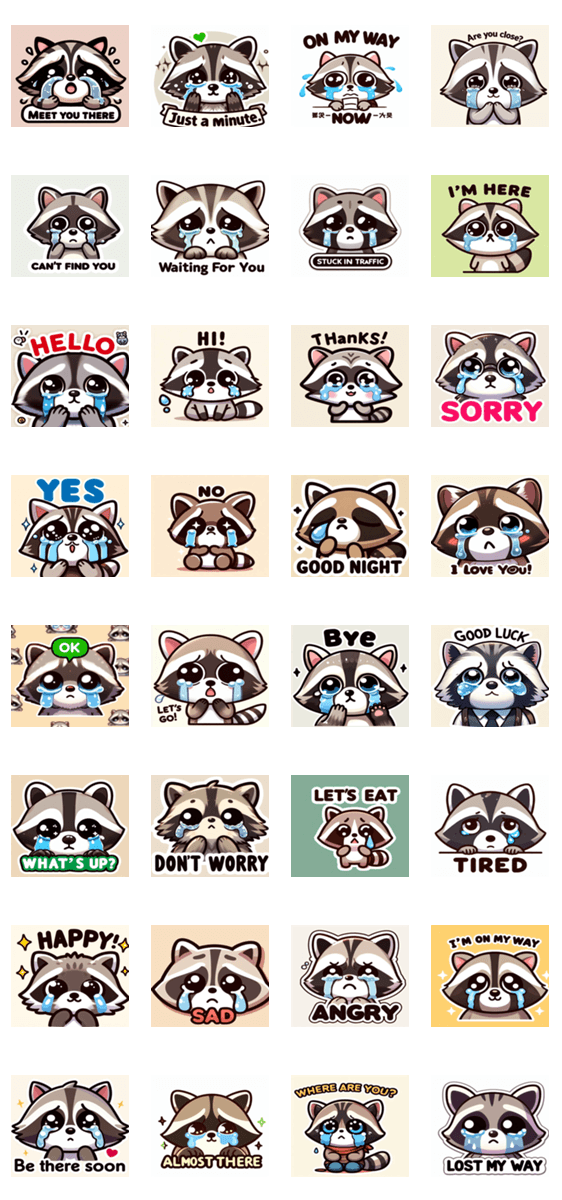 かわいいうるうるしたアライグマのスタンプ!悲しみや優しい気持ちを伝えるのにぴったりです。