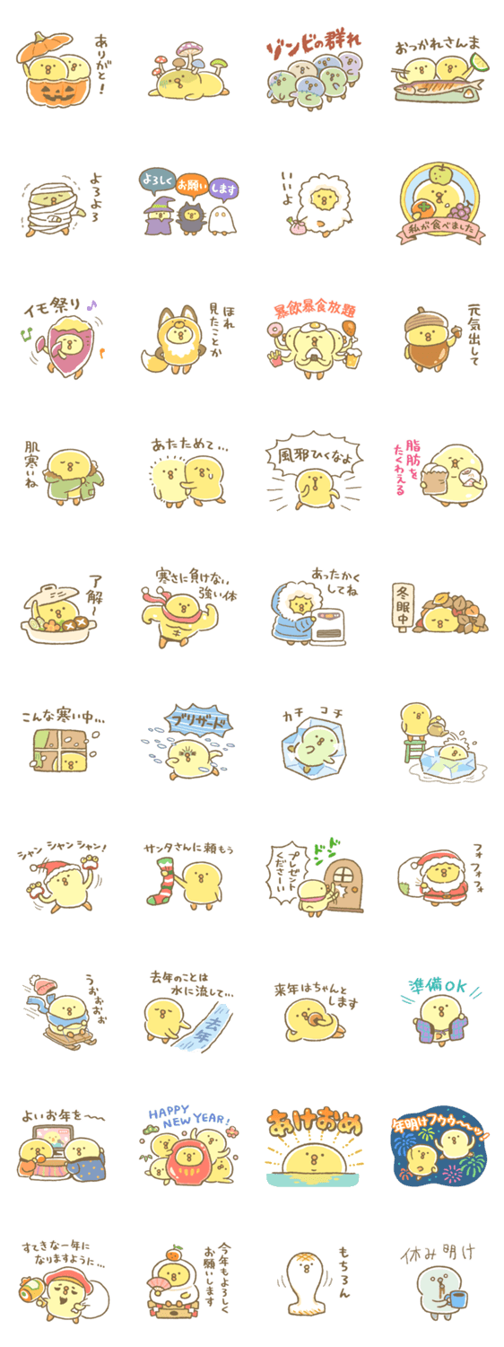 | スタンプ説明 | ひよこのような生き物、ぴよこ豆の秋と冬に毎年使えるスタンプだよ。ハロウィン/食欲の秋/クリスマス/お正月/年末年始 |