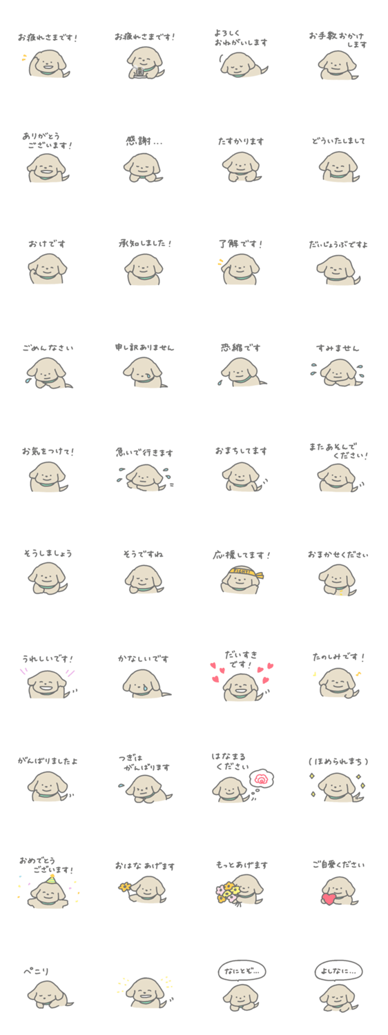 ほめられたいいぬのスタンプです。上司や先輩にも使いやすい敬語バージョン。ほめられたいひとに送ってみましょう。
