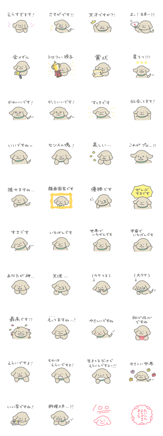 ほめるいぬのスタンプです。いろいろな褒め言葉でほめてくれます。敬語なので汎用性ばつぐんです。※誤字を訂正した修正版も販売しています→ほめるいぬ(修正版)