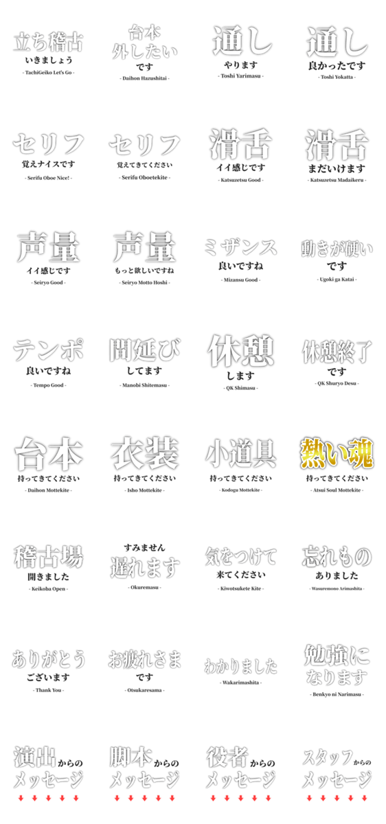 劇団の演出さん、脚本さん、役者さん、スタッフさんなど演劇関係者のためのスタンプです。配置さえ覚えれば文字より早いです。あと座組の雰囲気も和みます。Let's 稽古。