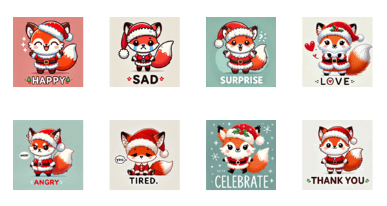 サンタの格好をしたかわいいキツネが、いろいろな感情を表現します。クリスマス気分を楽しんで!
