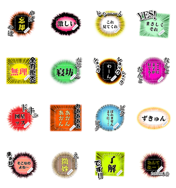 漫画・アメコミ風の好きな文が打てる吹き出しカラフルな吹き出し・集中線のフレームです★面白ネタ系メッセージスタンプは家族や友達・恋人とも使えちゃう♪ 現在この商品は一部のスマートフォン版LINE 10.3.0以上のトークルームでのみ使用できます。動作環境の最新情報はヘルプをご確認ください。