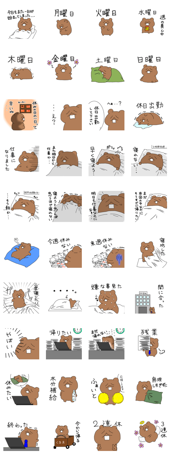 毎日使えるくまの熊谷さんスタンプです、曜日等も入っているので是非日常会話等でたくさん使って頂けると嬉しいです(谷)
