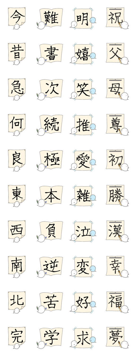 おばけが漢字一文字で気持ちを表してみました。夢、笑、尊、今、昔、何、愛、学、好、父、母、推、福、良、続、雑、明、本、東、西、南、北、幸、逆、漢、祝、嬉など。