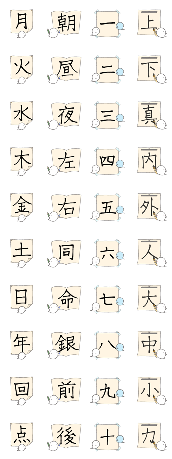 小学一・二年生で習う簡単な漢字がほとんどです。月、火、水、木、金、土、日といった曜日に、一~十の漢数字、朝、昼、夜、前、後、内、外、左、右、上、下、同、点など。