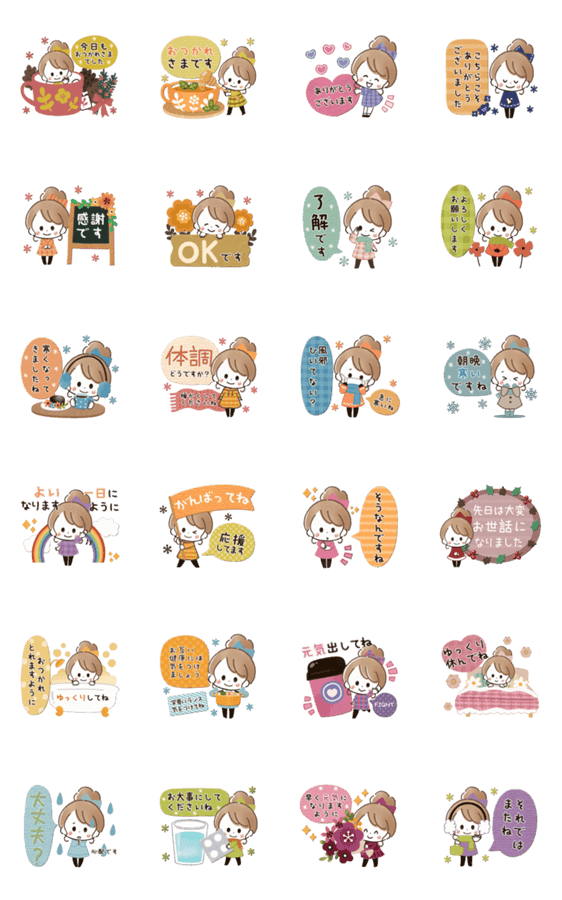 おだんごガールの可愛いカラフルなスタンプセットです。心のこもった気づかいをキュートにメッセージに添えられます。