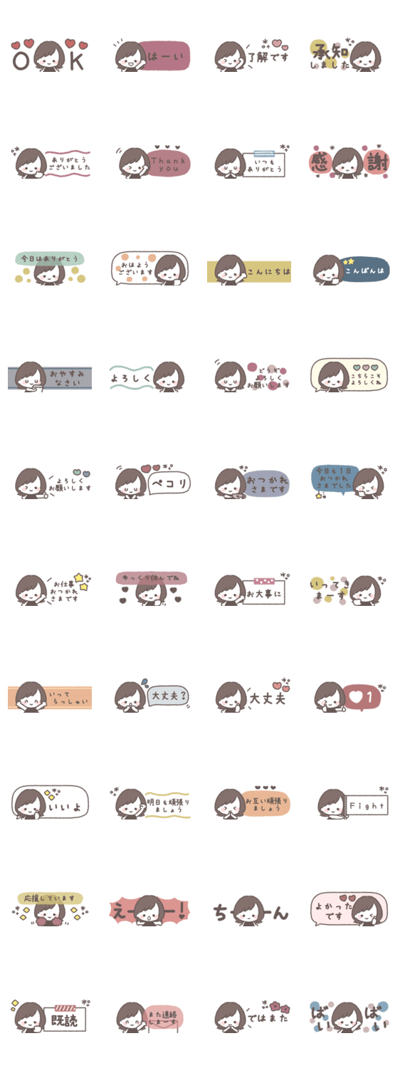一つあると便利な女の子のスタンプです。 女の子/ボブ/大人可愛い/シンプル/あいさつ/吹き出し/くすみカラー/省スペース