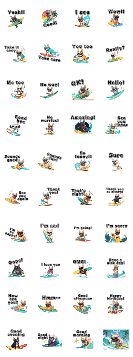 サングラスをかけたフレンチブルドッグがサーフィンするLINEスタンプ。英語のフレーズも入って、チャットに楽しくてクールな雰囲気をプラス。おすすめ!