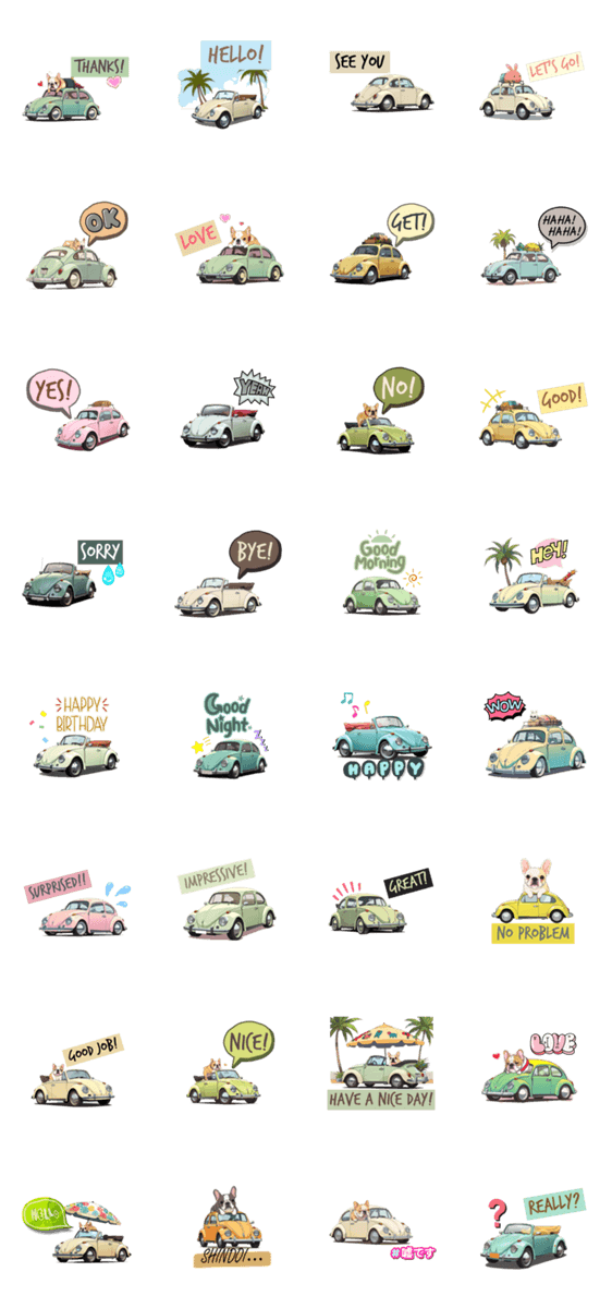 おしゃれで可愛い車のイラストに、ブルドッグとフレンチブルドッグのキャラクターが加わったLINEスタンプ。車好きも犬好きも楽しめるコレクション!