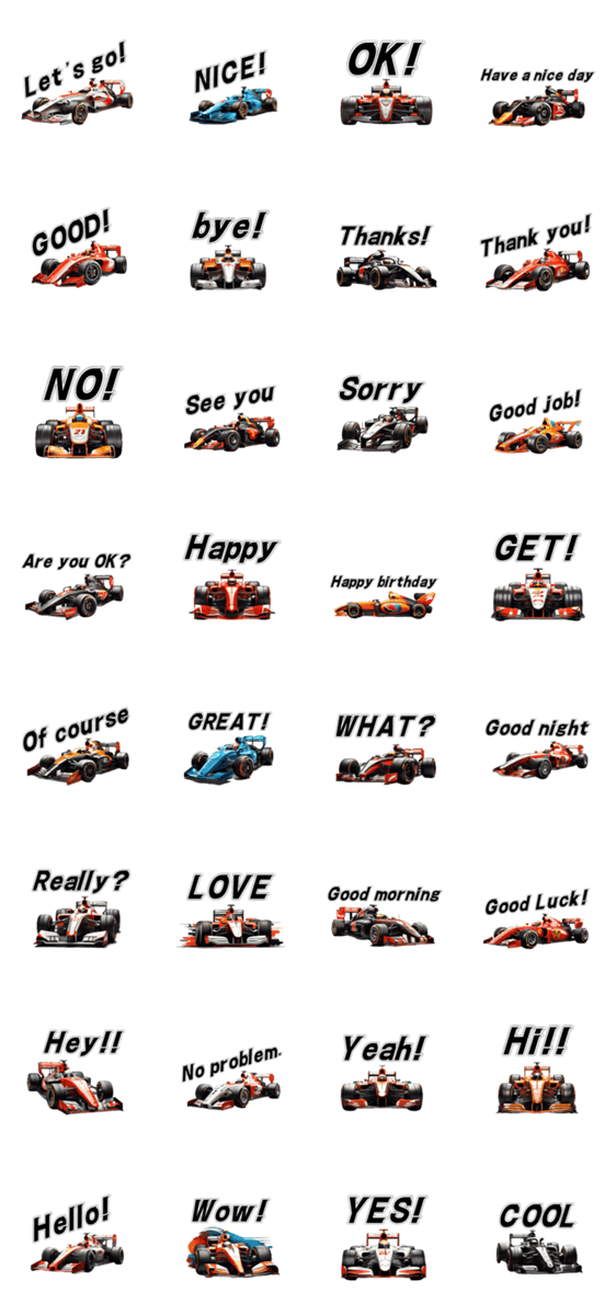 F1カーのイラストとスピーディーな英語のフレーズが魅力のLINEスタンプ。レースの興奮をそのままに、チャットを盛り上げます。F1ファンにおすすめ!