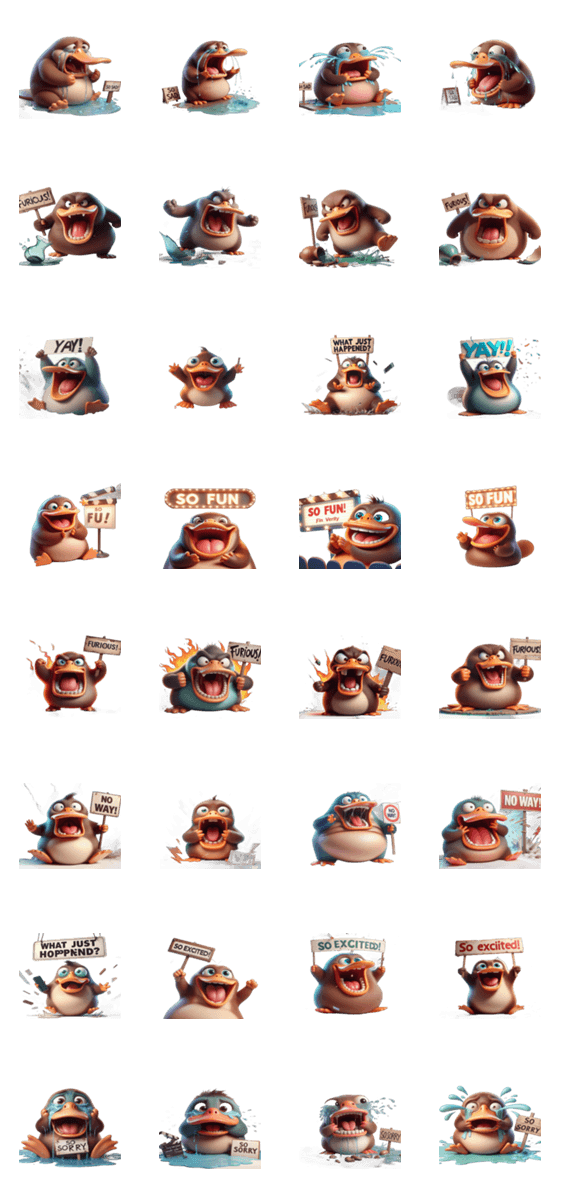 不安なカモノハシが謝るステッカー、不安、カモノハシ、ごめんなさい、間違い、感情、LINEスタンプ、イラスト、コミュニケーション