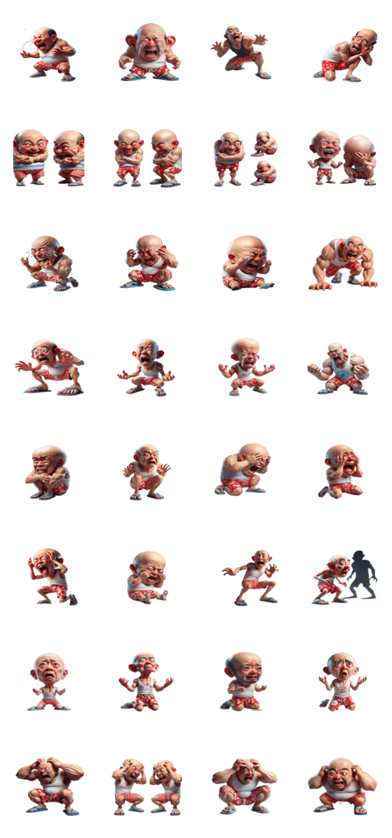 変なおじさんのユーモラスなステッカー、恐怖、困惑、ユーモア、面白い、LINEスタンプ、イラスト、コミュニケーション
