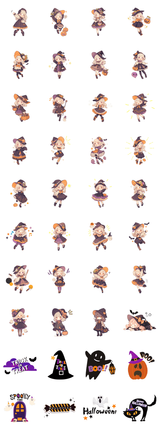 可愛い魔女が32枚、そのまま使ってもいい8枚のハロウィンメッセージセット!このスタンプ内でも、他のスタンプと組み合わせて楽しんだり…使い方はあなた次第です!