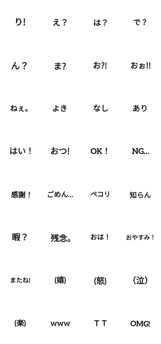 文字だけのシンプルなスタンプです。簡単に気持ちを送れて、シンプルが逆に心地よい。LINEスタンプメーカーでつくったスタンプです。