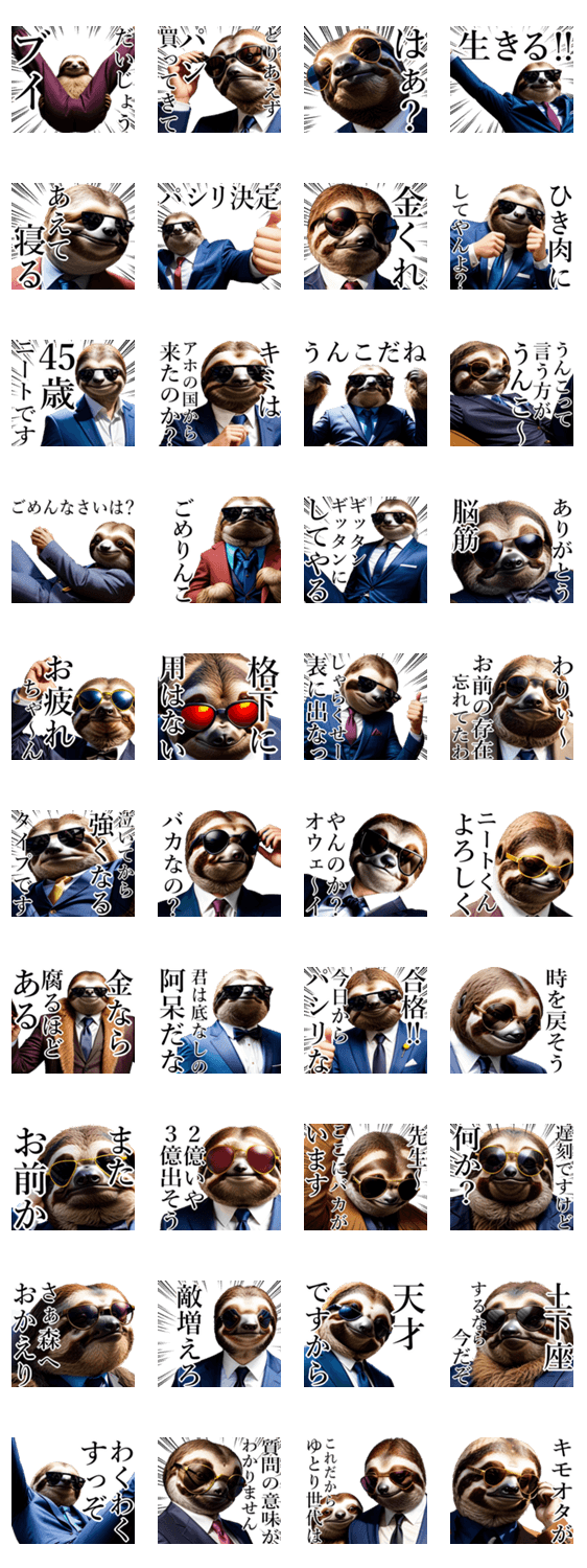サングラスしたリアルなナマケモノが面白くおかしく煽ってくれるおふざけスタンプです☆動物/煽り/ネタ/シュール/家族/友達/連絡/リアル/AI/面白い/生成/集中線/マンガ