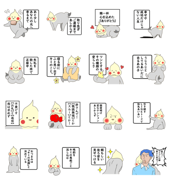 オカメインコとわんこの中間の不思議な生き物、『オカメわんこ』シリーズ第2弾・万能☆川柳編のスタンプです。おふざけしたい時にどうぞ。