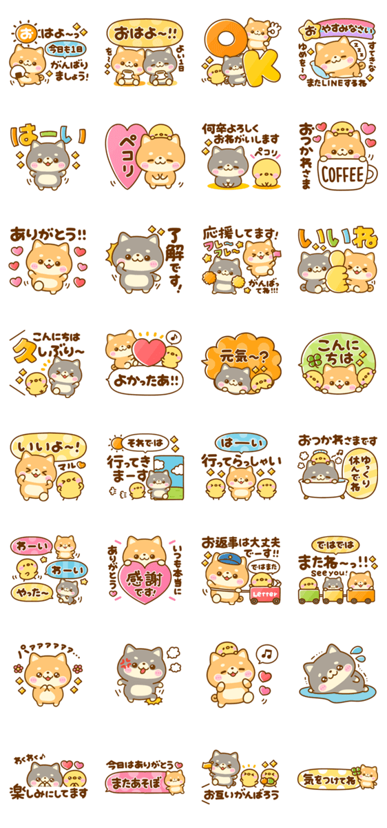 長文・デカ文字・省スペ・ミニキャラ・文字なし・ふきだし・ノーマル などいろんな種類のスタンプが入ってお得な豆柴日和のスタンプです。
