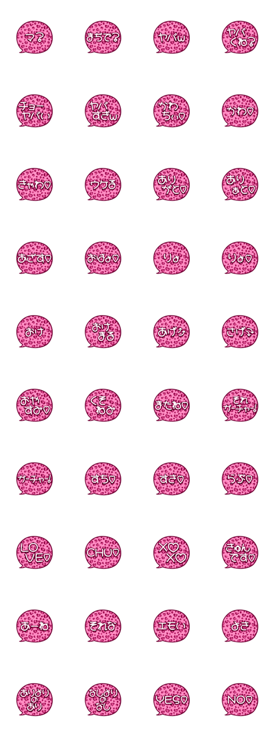 | スタンプ説明 | ヒョウ柄のギャル語スタンプです(吹き出し/ひょう/豹/動物/パンサー/大人可愛い/かわいい/ハート/cute/pop/ふきだし/紫/毎日使える/ガーリー/JK/大阪/スラング/ピンク) |