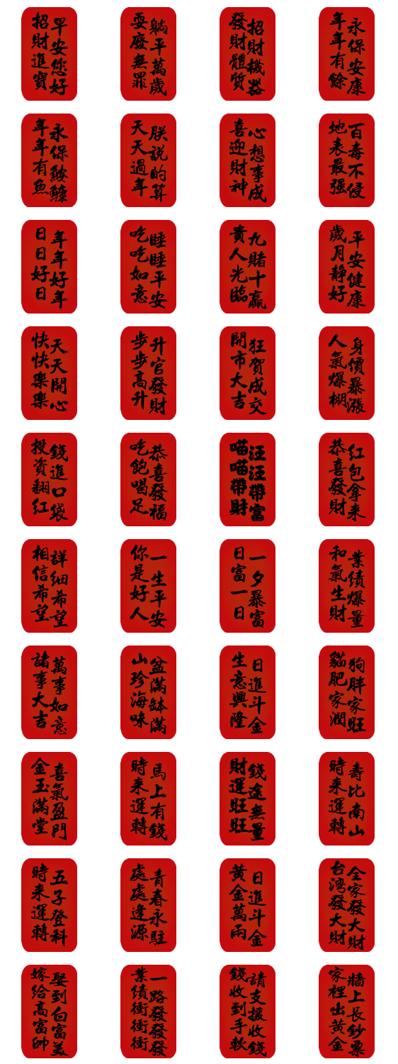 | スタンプ説明 | 新年のお祝い、祝福、富、赤い金、幸運、ポジティブなエネルギー。癒しの中国の書道ブラシ ビンテージ フォント動物ペット ※このスタンプはトークルームで大きく表示されるBIGスタンプです。 |
