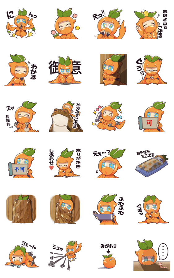 頭に葉っぱの生えたオレンジ色の忍び装束を着た忍者くんのスタンプです。