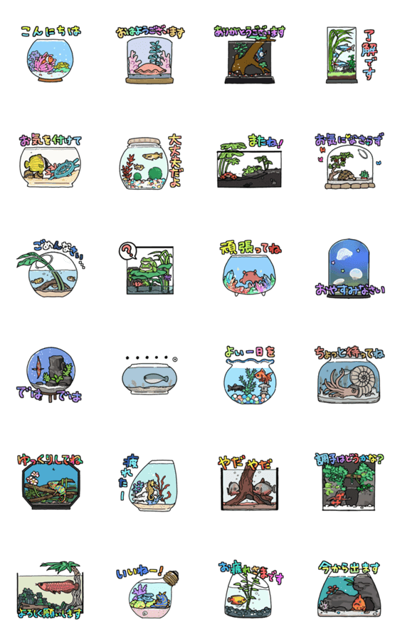 メッセージにアクアリウムやテラリウムのアニメーションスタンプを添えて癒されよう♪熱帯魚やアロワナなど海洋生物や淡水生物、古代生物のサカバンバスピスまで!