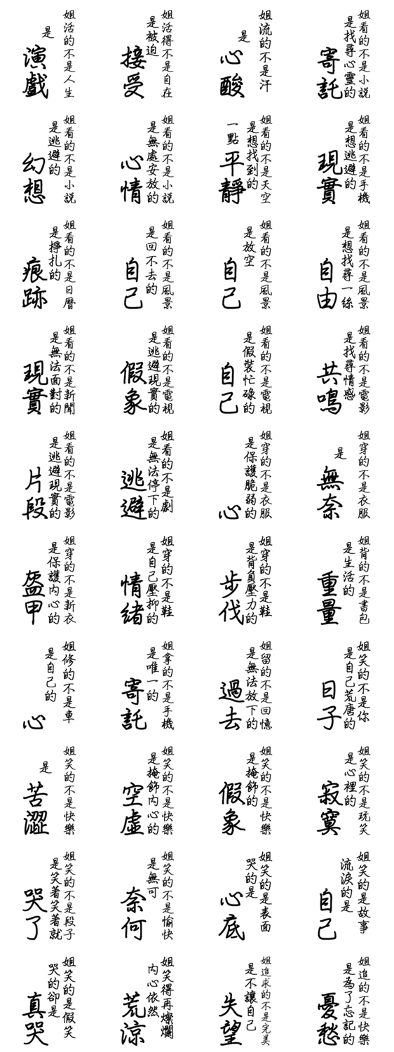 自虐、誇張、ユーモア、内面の矛盾などを使って、実生活における無力感や孤独感を表現します。 ※このスタンプはトークルームで大きく表示されるBIGスタンプです。