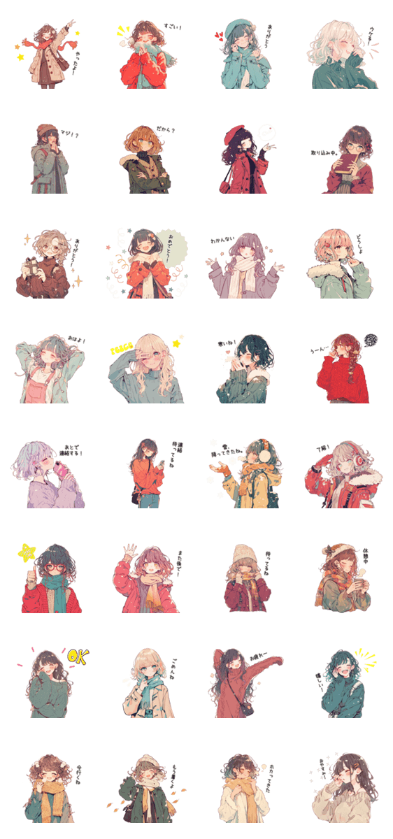 冬向けファッションの様々な女の子たちで伝える、友達や家族との気軽なやりとりにぴったりのスタンプです。楽しく使える32枚!冬の装いで、会話を盛り上げましょう!