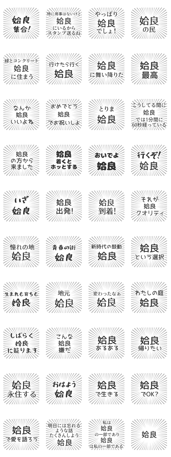 地元のための漫画風セリフスタンプ。集中線で叫べ。地元の人にも憧れてる人にも。面白いのが見つかると嬉しい。集中線。地元愛。