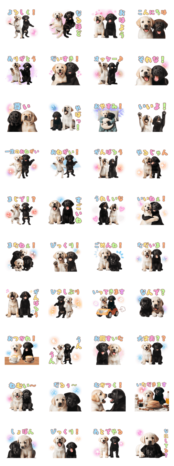 パステルカラーの文字と子犬(ラブラドール&黒ラブ)登場!!カラフルで気分が上がること間違いなし!ワンちゃん好きな方におすすめ。友達や家族、恋人や職場の人にぜひ!