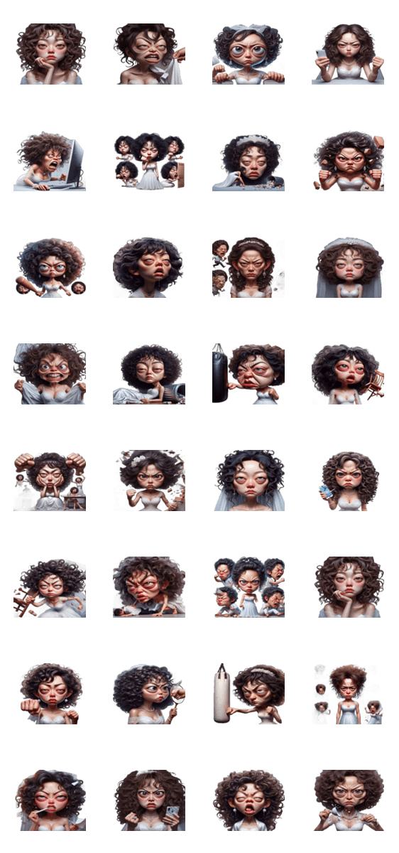 イライラする花嫁スタンプ、結婚式、迷惑な親戚、イライラ、ユーモア、花嫁、面白い、LINEスタンプ、イラスト、感情表現