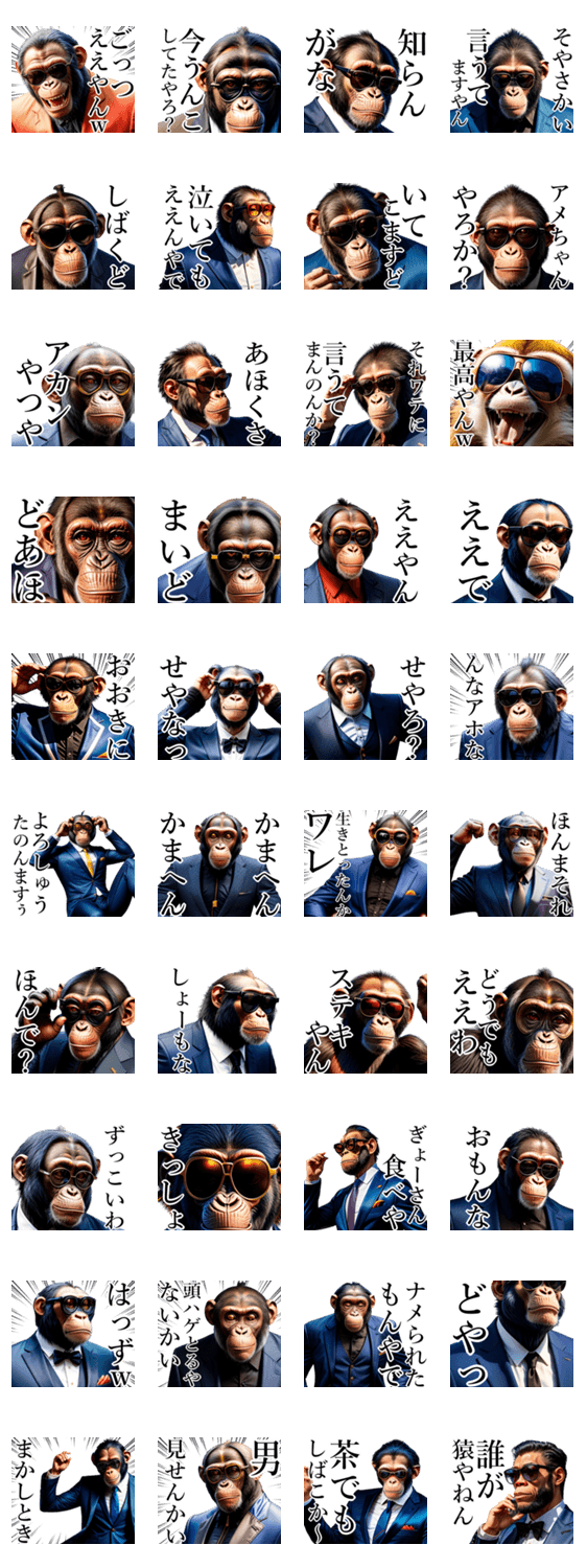 サングラスしたリアルな猿が関西弁で面白く喋ってくれるおふざけスタンプです☆猿/関西/大阪弁/サングラス/ネタ/シュール/サラリーマン/仕事仲間/連絡/AI/写真/方言/挨拶