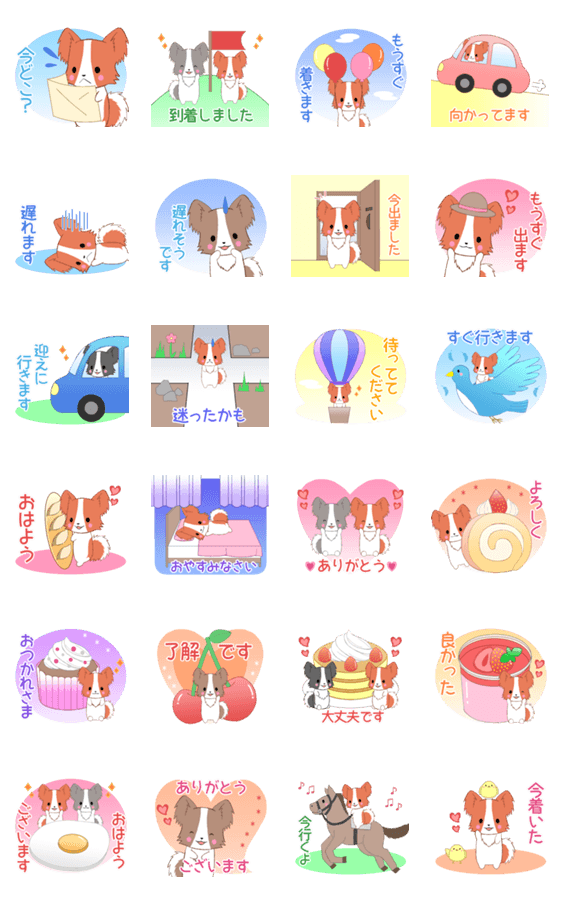 小さいパピヨンたちのスタンプ第14弾。レッド/セーブル/ブラウン/ブラック/カワイイ/可愛い/キュート/犬/イヌ/もふもふ/モフモフ/挨拶/日常会話/気持ち/感情