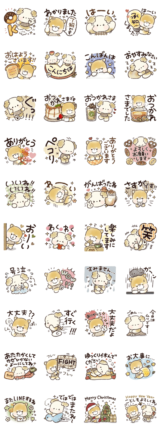 かわいい2匹の犬のスタンプです♪日常で使いやすい言葉がたくさん♡挨拶/優しい/ベージュ/芝犬/カフェ/パン好き/クリスマス/お正月