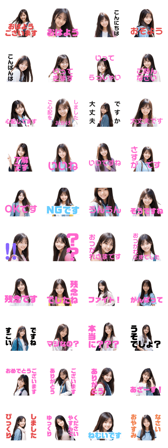 | スタンプ説明 | LINEスタンプメーカーでつくったスタンプです。商用利用可能なAIアプリSeaArtで作った架空の女子大生20歳のスタンプです。未成年はいません。 |