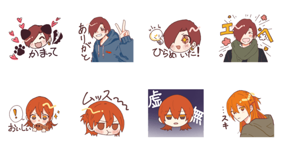 晶(オレンジ)と梓乃(赤)の、ほのぼのスタンプです。