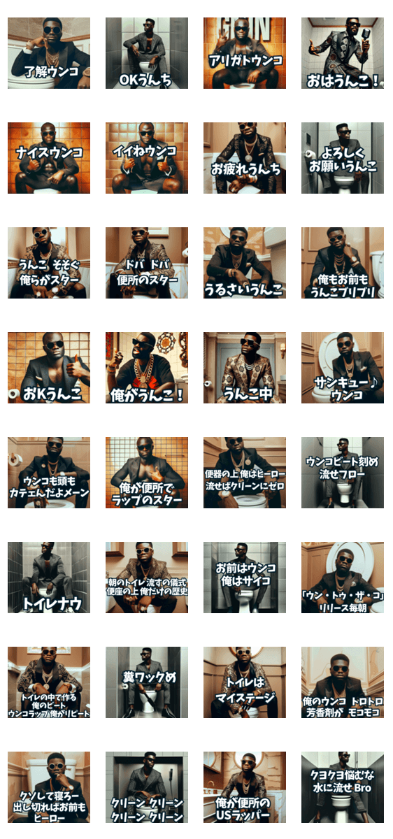 | スタンプ説明 | 下ネタ/汚い/トイレ/下品/黒人USラッパー/ヒップホップ/ライム/韻/MCラップバトル/フリースタイル/ジョージ/輩/格闘技/家/喫煙者/おもしろいあおり/あおる/面白い煽り/煽る |