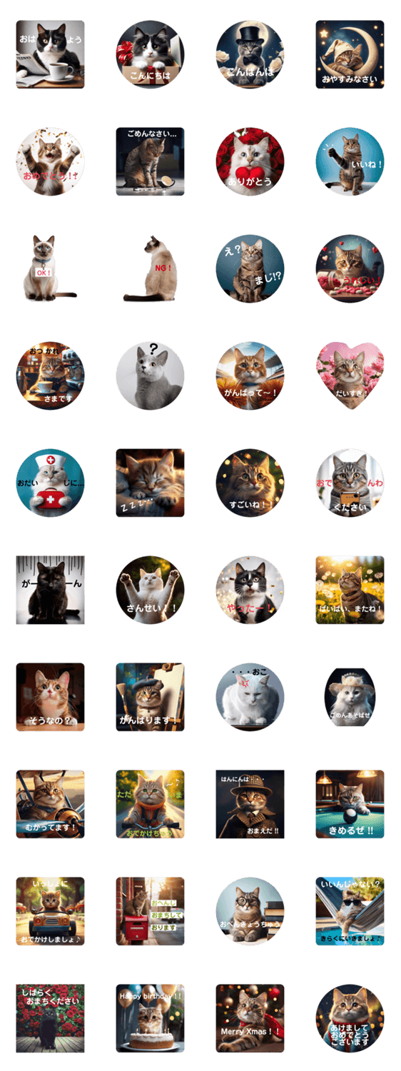 画像生成AIで作ったキュートな猫・ねこ・cat!世界中のネコ好きさんに使って欲しい、にゃんとも可愛いスタンプ、ハチワレ、アメショー、シャム、毛長、色々いるよ!