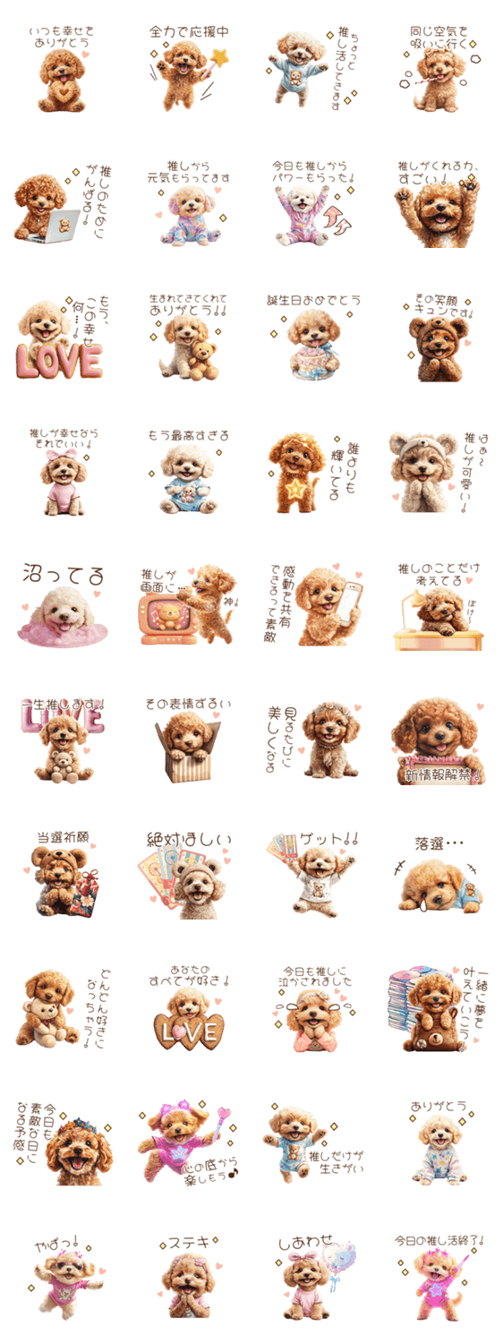 大好きな推しを全力応援する可愛い子犬トイプードルのスタンプ!推しから元気をもらったり癒されたりと推しのいる生活を楽しむ、愛にあふれた言葉満載♪