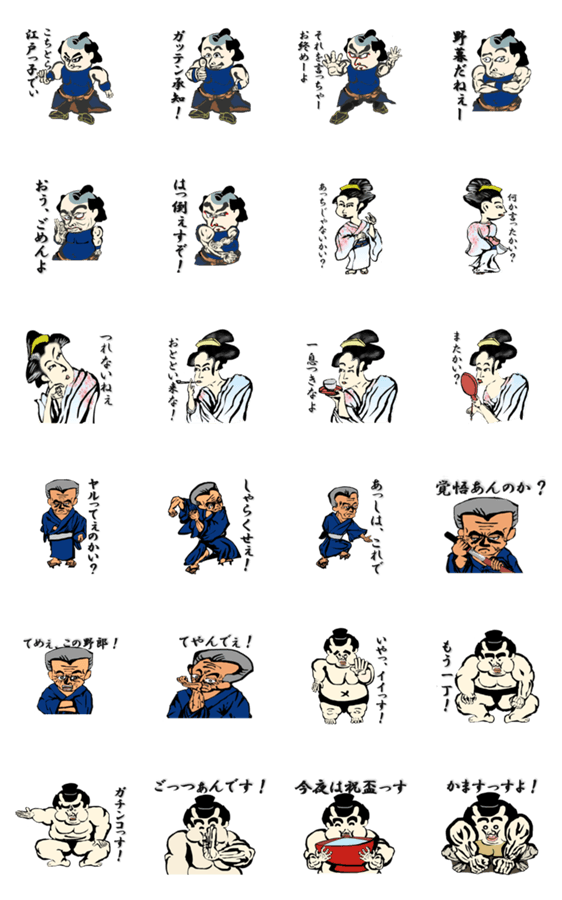 スタンプ説明 浮世絵風の江戸っ子気質な愉快なキャラクター