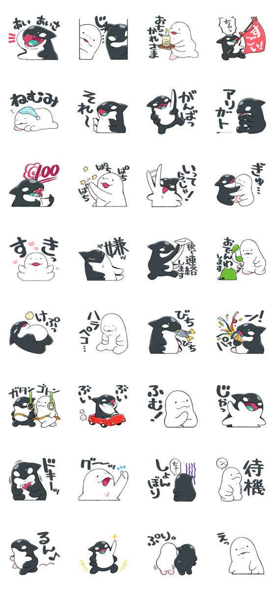 シャチ型の宇宙人「シャチ太郎」のLINEスタンプです第2弾です。シャチ太郎は宇宙人なので手(触手)が4本です。白いのはシロイルカ型の宇宙人「ぺるちゃん」です。