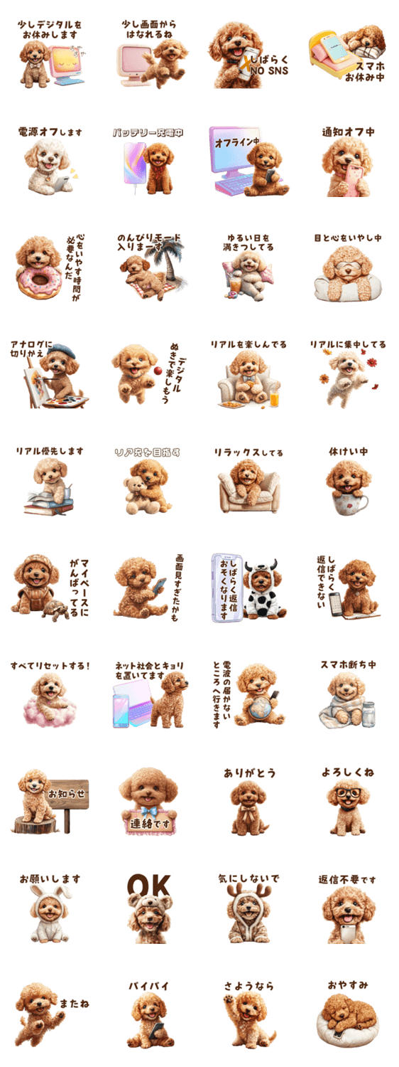 メッセージやSNS等デジタルから離れたい時に使える子犬トイプードルのスタンプ。 のんびり過ごしたいときや、少し休みたいときにぴったり。気持ちの切り替えにもどうぞ。