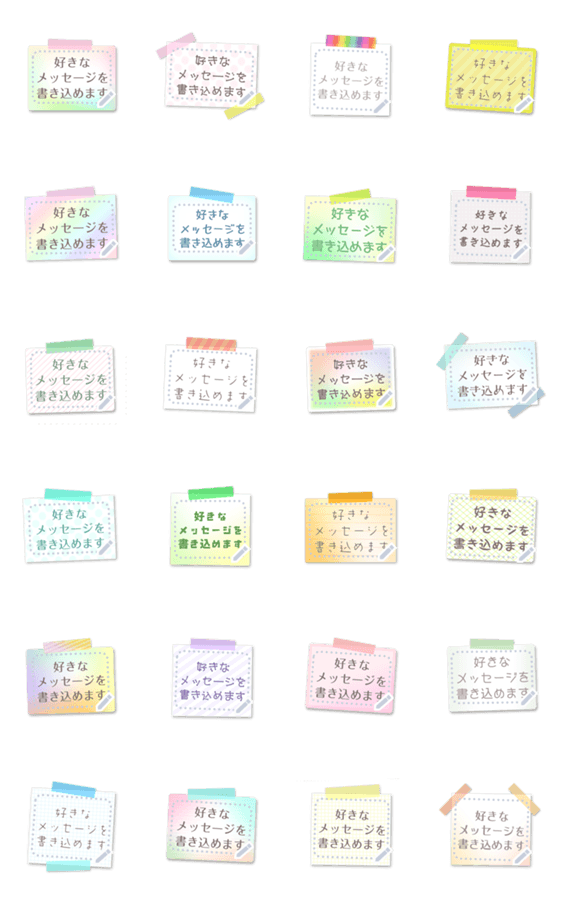 好きな文章を書き込める付箋・ポストイット・メモ帳をマステでペタッと貼ったシンプルで大人可愛いカラフルメッセージスタンプ♪縞々や水玉柄も♪家族や友達とのトークに♪ 現在この商品は一部のスマートフォン版LINE 10.3.0以上のトークルームでのみ使用できます。動作環境の最新情報はヘルプをご確認ください。