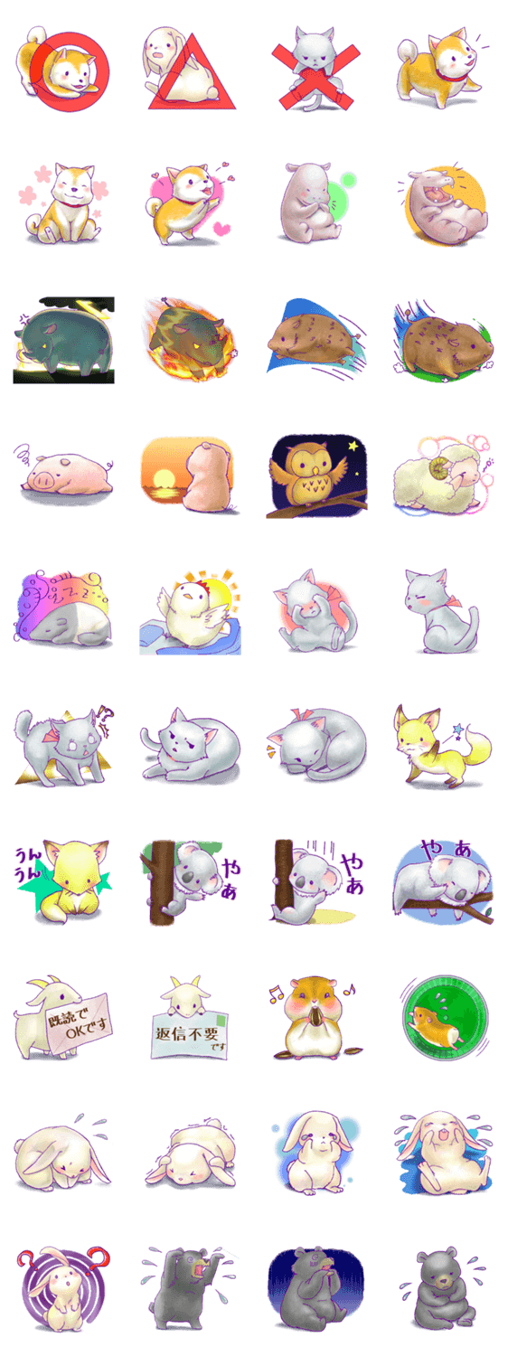 優しい色合いの動物スタンプです。ほんわか犬やツンデレ猫、怖がりウサギ、のんびりコアラに臆病クマなど個性豊かな動物達がゆるく可愛くあなたの気持ちを表現します。