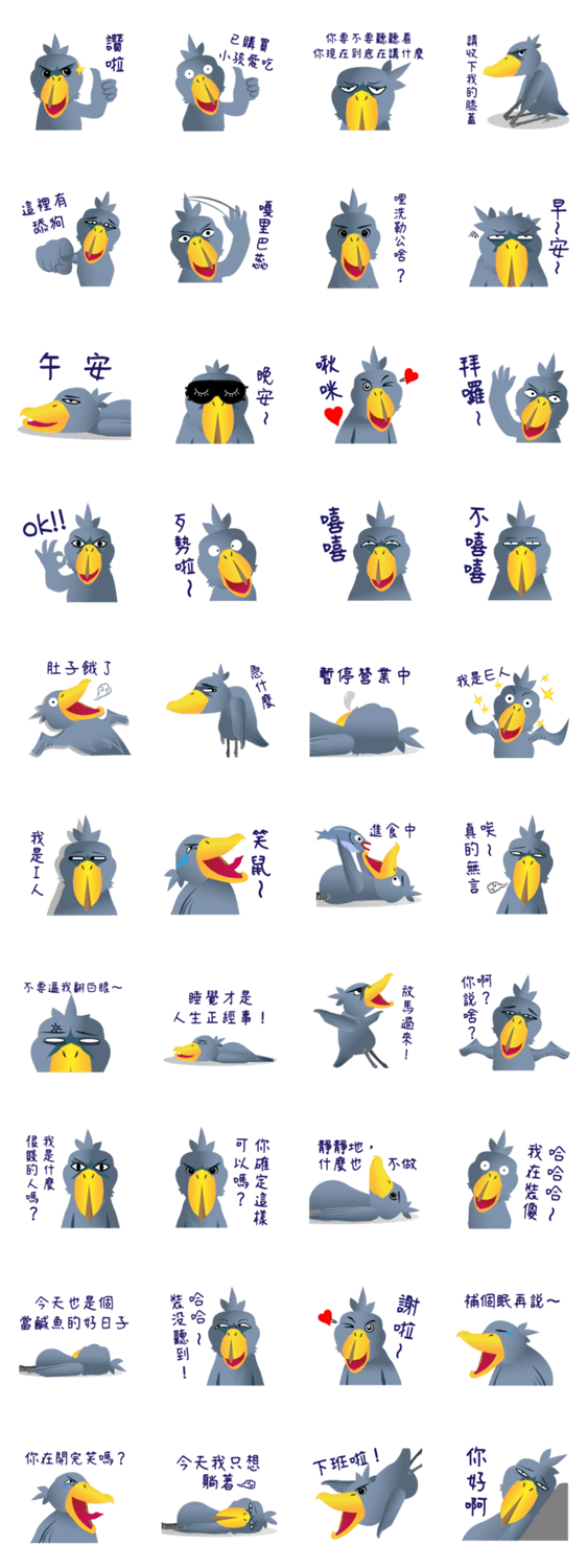 | スタンプ説明 | Using a shoebill stork as the character, it uses relaxed and humorous language to express the feeling of fatigue at work. |