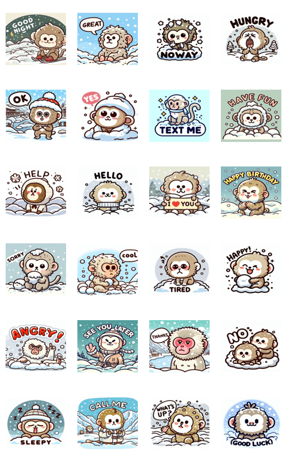 雪の中で遊ぶテナガザルの楽しいスタンプセットです。冬の喜びと面白い表情をチャットに添えます。