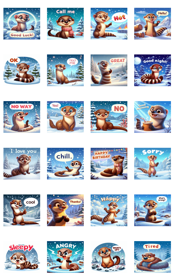 雪の中で遊ぶマングースの可愛らしいスタンプセットです。冬の冒険心をチャットにプラスします。