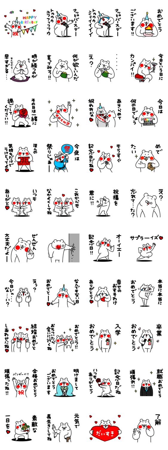 全力でうざい全力でおちょくるあざとかわいいくまのお祝いスタンプ。入学・卒業・結婚・就職・誕生日・記念日・正月・出産・合格。全部おめでとう!今夜は祭りだ!